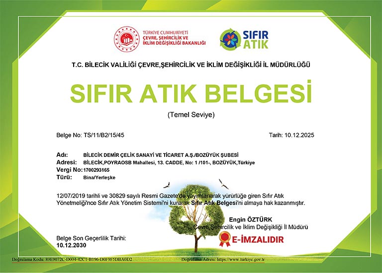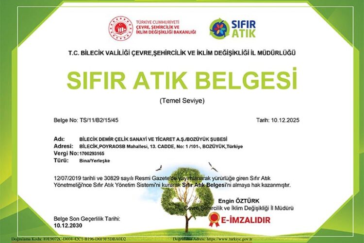 Atık Yönetimi ve çevre bilincinin oluşması amacı ile Bilecik Demir Çelik San. ve Tic. A.Ş. 2018 yılı itibari 14001 Çevre Yönetim Sistem Belgesi almıştır.